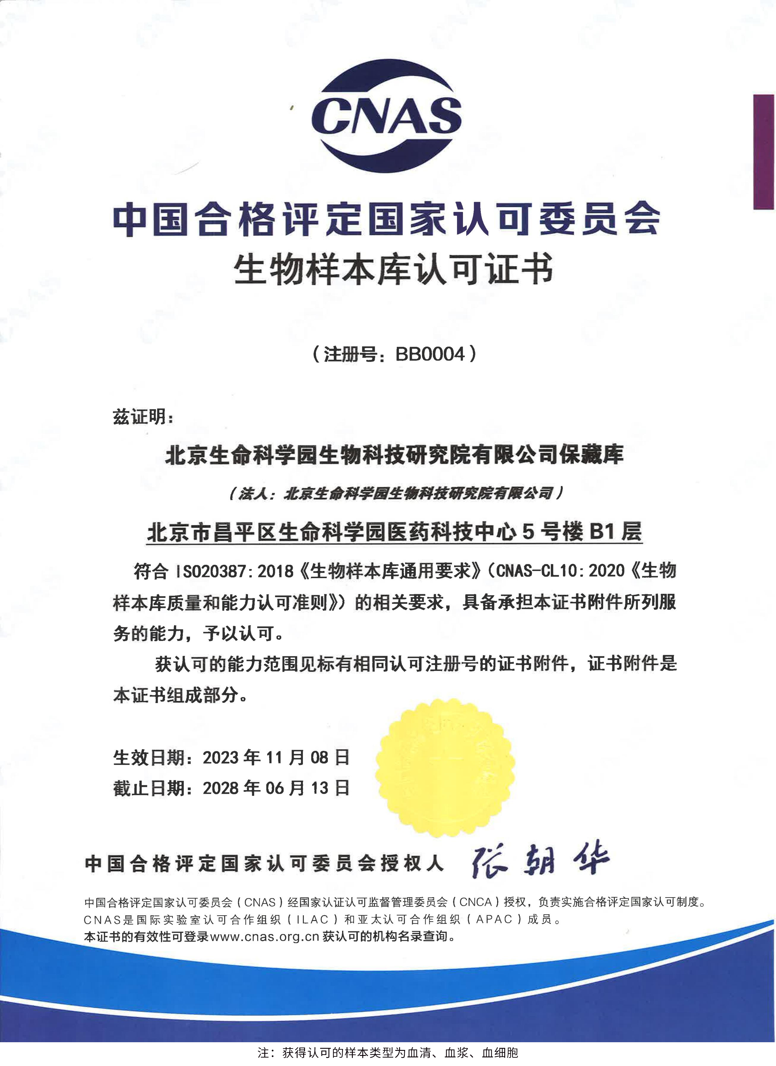 北京生命科學(xué)園生物科技研究院(以下簡稱“北京生物樣本資源庫”)(Biobank of Life Science Park,簡寫“BoLSP”)是一家由北京市科委和中關(guān)村生命科學(xué)園共同支持設(shè)立的第三方生物樣本庫公共服務(wù)平臺,秉承北京重大疾病臨床數(shù)據(jù)和樣本資源庫(以下簡稱“北京庫”)(Beijing Biobank of Clinical Resources,BBCR)十余年的發(fā)展成果,聚合眾多臨床樣本專家的專業(yè)共識,致力于在生命科學(xué)、生物醫(yī)藥研究領(lǐng)域發(fā)揮銜接樣本資源持有者與研究者的橋梁作用,解決生物樣本資源開發(fā)上下游信息不對稱、資源共享困難等問題。研究院在北京中關(guān)村生命科學(xué)園昌平園區(qū)建立了2000㎡生物樣本庫,最大存儲規(guī)模達(dá)1000萬份。研究院遵循CNAS-CL10:2020《生物樣本庫質(zhì)量和能力認(rèn)可準(zhǔn)則》,同時結(jié)合北京庫過去十年的工作經(jīng)驗與教訓(xùn),建立了一套完善的生物樣本保藏質(zhì)量管理體系,從人、機(jī)、料、法、環(huán)、控多個角度,實現(xiàn)生物樣本保藏過程的全面質(zhì)量控制,先后獲得國家科技部頒發(fā)的人類遺傳資源保藏行政許可證書和中國合格評定國家認(rèn)可委員會(China National Accreditation Service for Conformity Assessment,CNAS)頒發(fā)的“CNAS認(rèn)可證書”。